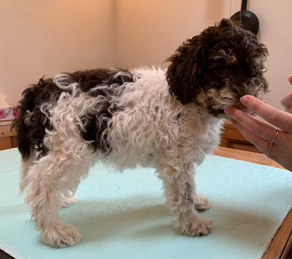 Farbe: Bianco-Marrone, Fell-Typ: Gelockt, Fell-Muster: Focato